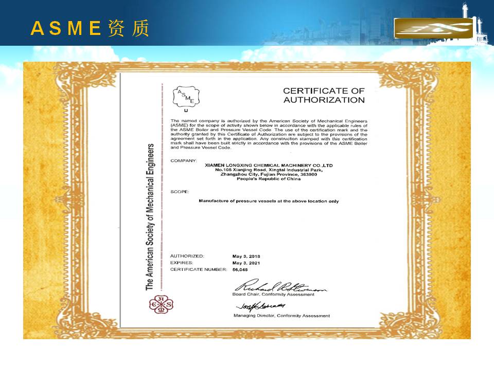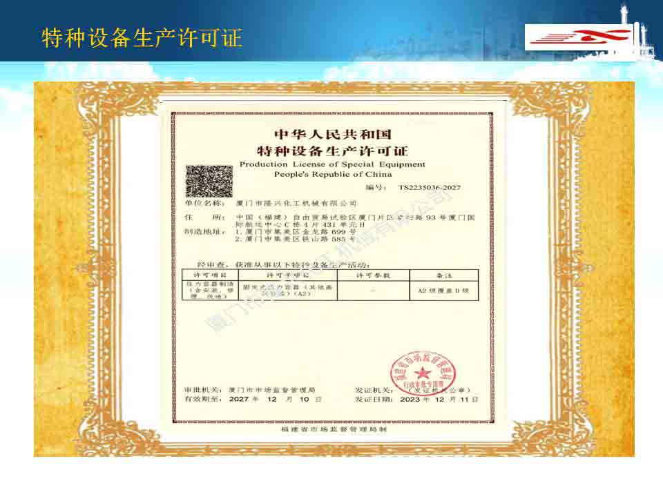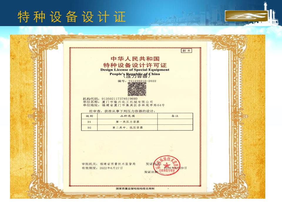 廈門隆興化工機(jī)械有限公司成立于2001年5月,占地面積30000平方米,擁有生產(chǎn)車間面積10000平方米及相關(guān)配套的辦公場所3000平方米,其中下料場所1000平方米,不銹鋼制作場所2000平方米,ASME產(chǎn)品制作區(qū)域1200平方米,無損曝光室30平方米。公司有職工135人,擁有專業(yè)的技術(shù)人員和管理人員36人。公司主要從事設(shè)計(jì)、制造A2級覆蓋D類壓力容器...