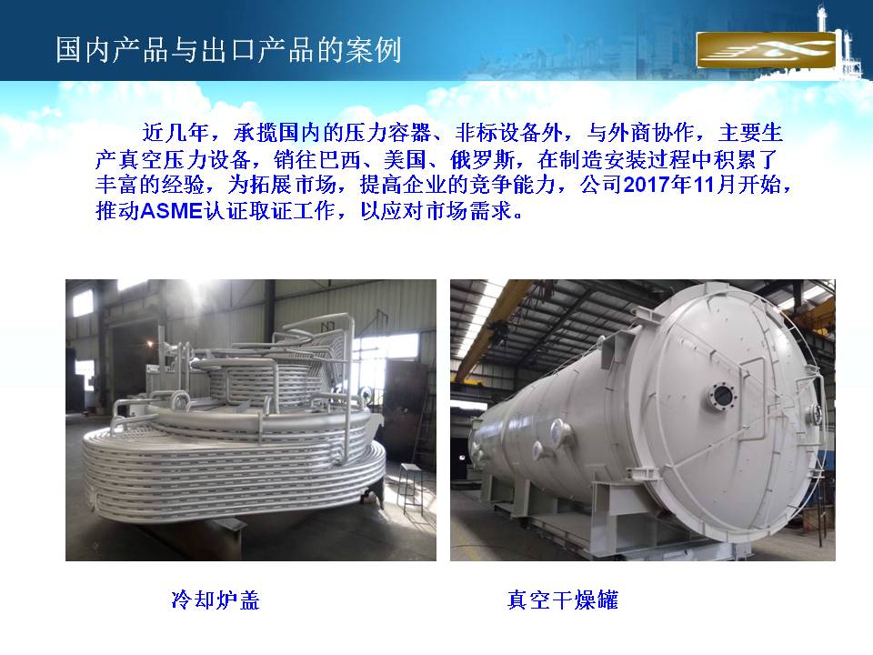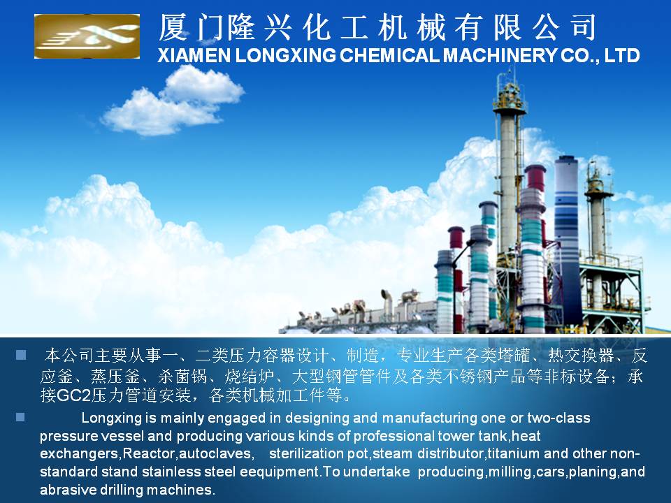 廈門隆興化工機(jī)械有限公司成立于2001年5月,占地面積30000平方米,擁有生產(chǎn)車間面積10000平方米及相關(guān)配套的辦公場所3000平方米,其中下料場所1000平方米,不銹鋼制作場所2000平方米,ASME產(chǎn)品制作區(qū)域1200平方米,無損曝光室30平方米。公司有職工135人,擁有專業(yè)的技術(shù)人員和管理人員36人。公司主要從事設(shè)計(jì)、制造A2級覆蓋D類壓力容器...